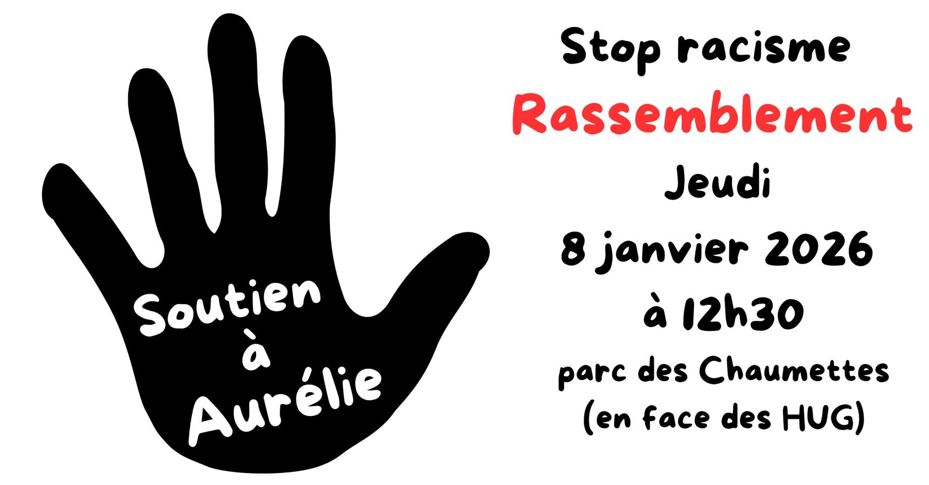 Pour soutenir Aurélie, nous appelons toutes les personnes, employé-e-x des HUG ou simple citoyen-ne-x que le racisme révulse, à venir manifester devant les HUG, au Parc des Chaumettes, le jeudi 8 janvier 2026 à 12h30 !